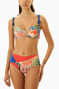 A fine mix of print & colour block, this bikini set is a bikini lovers staple piece. Blend of golden trims, interesting knots & use of knit & satin materials. Knotted concept on straps & bottoms. It has a push-up bikini top with satin straps and narrow band at back with Tizzi trim. Made for medium coverage and has non-removable pads.