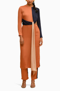 This elegant ankle-length dress features a solid design with a flattering round neckline and full-length sleeves. The knot detail adds a unique touch, while dual-tone accents create a stylish contrast. Designed for easy wear with a slip-on fit, this piece offers a perfect blend of comfort and sophistication.