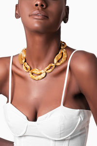 Inspired by the gnarly forms and texture found on the knotty pine trees, this maximal link necklace is a bold and sensational addition to an outfit. The imperfect yet ornamented texture is enclosed in link forms inspired by the rustic knots and holes found on the bark of aged trees.