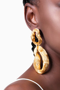 Inspired by the gnarly forms and texture found on the knotty pine trees, these maximal link earrings are a bold and sensational addition to any outfit. The imperfect yet ornamented texture is enclosed in link forms inspired by the rustic knots and holes found on the bark of aged trees.