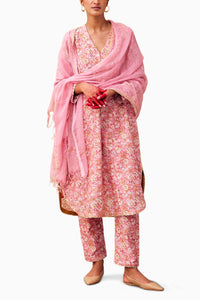 Embrace timeless elegance with this light pink kurta, beautifully block-printed and crafted from luxurious Chanderi fabric. The kurta features full sleeves and intricate bijiya gota detailing at the hemline and sleeves. It’s paired with Chanderi pencil pants, designed for comfort with an elasticated back and a front zipper opening with button fastening. The ensemble is completed with a Kota Doriya dupatta, made from soft cotton and embellished with bijiya gota along the hem. The kurta is fully lined, with a flattering V neckline and practical side seam pockets, offering both style and functionality.