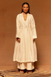 The Komorebi Long Jacket is a perfect blend ofstrength and softness, crafted from embroidered chanderi with intricate cutwork. Its tailored silhouette,enhanced by a stripe lapel and gathered panels,creates a polished yet relaxed look that exudesconfidence and sophistication. The jackets refinedstructure is balanced with feminine details, making it