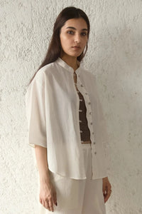 The Butterfly Blouse Kora is a relaxed cropped shirt designed for effortless elegance and comfort. Made from soft, lightweight handwoven raw cotton, it offers a breathable and airy feel, perfect for everyday wear. The drop shoulder and half sleeves enhance its easygoing silhouette, while delicate silk loops add a refined touch. Featuring a button-down front, this versatile piece can be worn on its own or layered for a more dynamic look. Designed in a free size, it comfortably fits up to a 39-inch (99 cm) chest.