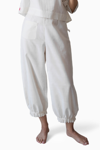 A gathered pajama that ruffles at the bottom giving a soft feminine look.