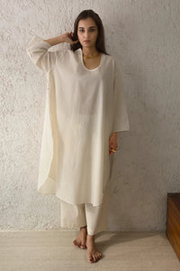 The Overlap Petal Shift is an oversized silhouette designed for effortless elegance and comfort. Crafted from breathable raw cotton with delicate silk trims, it offers a soft, natural drape that enhances its relaxed appeal. The unique side-overlapping design adds a touch of fluidity, while the U-neckline and three-quarter sleeves create a refined yet easygoing look.