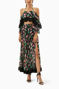 Aqua's Krabi Top & Skirt reveals clever balance of timelessness and modernity. Designed in georgette fabric the set is styled with an on-trend off shoulder neckline, asymmetrical cut and a classic cut bottom that provides moderate coverage with a slit. This set has sleeve ruffles, skirt side slit and tassel detailings.