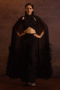 Featuring Krasa Black Feather Cape Sleeves Blouse with Pants by The House of Exotique's Nagma Collection. The high-neck, padded blouse with cap sleeves features long open sleeves adorned with feathers at the bottom, fully embellished, with a center back hook and zipper fastening. The fit-and-flare embellished pants have a broad waistband and side zipper fastening, crafted from crepe, crinkle chiffon, and net in a bold black hue for an elegant, statement look.
