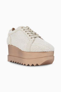Next up on the wedding aisle is our cool, sweet, and festive pick. Meet Kulfi Couture—a shoe so graceful, it's hard not to do your most regal walk in them. Crafted in white and silver shimmery fabric, this shoe is adorned with ivory cutdana work, silver sequins and ivory glass beads. A wedge, a sneaker, and a whole lot of intricate Indian handicrafts have