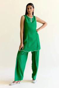 The Kurta is tailored in the finest silk and decorated delicately with pearls . The sleeveless kurta is short and has a fitted bodice. The hemline of the dress is finished with our signature handcut scallops inspired by Mughal arches.