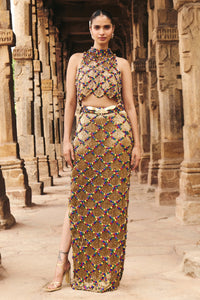 Gold Lattice skirt and top with cut dana work on net lining all over, and multi coloured stones set into a lattice pattern. The skirt features our custom brand logo on the belt.
