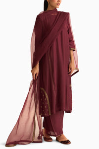 It's a three-piece garment made in cotton silk and Organza. Colored in a deep emotive shade of wine. The A-line cut of the kurta is embellished with gold dabka borders, complimenting the sensuality of wine with the straight broad fit of the pants in cotton silk.