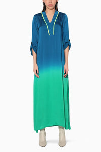 This resort-ready long tunic dress features a deep, hand-done saturated ombre that creates a beautifully rich gradient of color. Side slits offer fluid movement, while gold button details add a touch of elegance and luxury, making this piece the perfect blend of laid-back sophistication and tropical style.