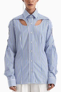 La fente shirt from Notre Ame features an exquisite slit design complimenting the blue stripes. Handcrafted in fine cotton, blue stripes add a touch of sophistication while gathered sleeves bring forth its elegance in a flattering fit.
