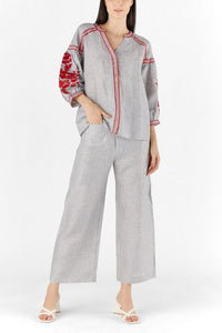 These high-waisted trousers are made from handloom linen. They feature a vertical stripe pattern in grey and blue.