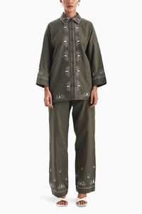 La broderie palmette co-ords from Notre Ame exudes comfort and sophistication. Handcrafted in breathable cotton-jute, this lightweight olive set adorns hand embroidered palmette motifs. The shirt and wide-leg pants, a flattering look, adds a touch of elegance blending traditional technique with modern design.