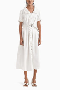 La soiree shirtwaist ruffled midi dress from Notre Ame is handcrafted in fine cotton twill. The crisp white dress is detailed with denticule ruffles on placket and sleeve hems ending with a delicate lace. Le col haut adds a raised collar detail and ruffles into a lace finishing. The shirtwaist dress embodies meticulous craftsmanship, alluding a sophisticated opulence.