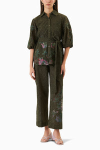This military green cotton eyelet set features stunning cutwork appliqué embroidery, blending intricate detailing with a bold, stylish look. Perfect for adding a touch of sophistication and uniqueness to your wardrobe.