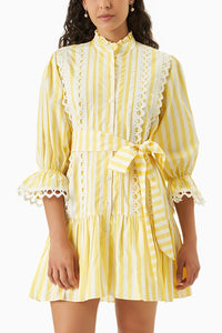 Lace And Line Dress by Trisara features yellow and white stripes in cotton fabric with scallop lace detailing. It has a regular fit, combining comfort with a delicate, feminine touch—perfect for casual or semi-formal occasions with a fresh, summery vibe.