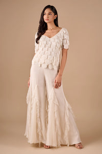 These lace ruffle godet pants blend structure with softness, featuring cascading ruffles and flared godets that move beautifully with every step. Effortlessly romantic and refined.