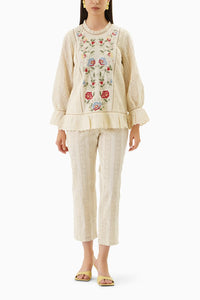 Featuring a srtuctured sleeves lace trimmed blouse and pants with an eyelet lace details. This is a stunning blouse with dainty details..