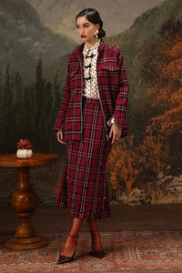 Featuring Lady Celeste by Mero's Noir Eclat Collection, this check tweed jacket is paired with a crystal-embellished peplum skirt in rich maroon. Crafted from premium tweed, this coords set combines classic style with a touch of luxurious sparkle.