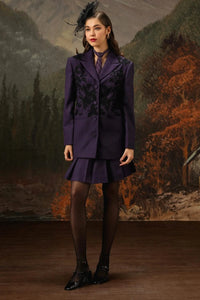 Featuring Lady Maisal by Mero's Noir Eclat Collection, this embroidered blazer is paired with a pleated skirt in purple cotton. A refined coords set that blends intricate embroidery with timeless pleats for a sophisticated, elegant look.