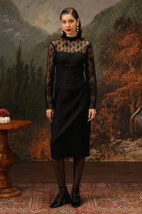 Featuring Lady Matilda by Mero's Noir Eclat Collection, this midi corset dress is crafted from black linen, featuring a delicate lace yoke and sleeves. A timeless, sophisticated piece that combines structure with soft, romantic details for a bold, elegant look.