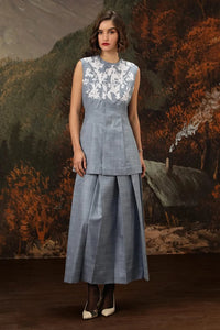Featuring Lady Sara by Mero's Noir Eclat Collection, this top with delicate floral embroidery is paired with a pleated skirt in blue cotton. A graceful coords set that blends feminine charm with soft, airy elegance for a fresh, stylish look.