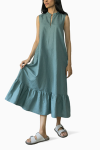 This summery maxi dress is light and breathable with a gathered flowy bottom. It has a mandarin collar and zipper neckline that you can style as per your mood. Discreet side seam pockets.