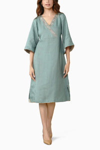 This flattering V-neck dress features a loose, flowy silhouette that drapes gracefully over the body, with a tie at the waist and wide sleeves for effortless movement throughout the day. Embellished with geometrically patterned rose gold studs using heat press craft, it adds a touch of festive elegance to your wardrobe.