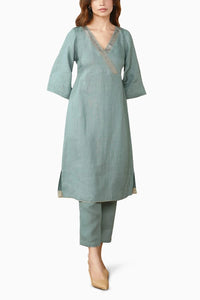 This flattering V-neck kurta features a loose, flowy silhouette that drapes beautifully over the body, with a waist tie and wide sleeves for effortless movement throughout the day. Embellished with geometrically patterned rose gold studs using heat press craft, it adds a touch of festive elegance, perfect for any special occasion.