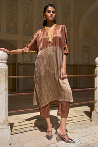 V-neck tunic top in crinkled and textured lamé fabrics in earth tones. Colour blocked in shades of caramel, mustard and coffee. Popover top in a relaxed fit. Half sleeves, side slits.