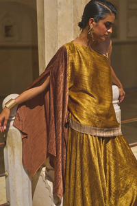 One shoulder top in crinkled and textured lamé fabrics in earth tones. Colour blocked in shades of caramel, mustard and coffee. Popover top in a relaxed fit. Dramatic drape panel on one shoulder.