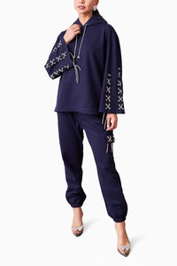 A stylish navy blue co-ord set with beautiful cross-tie detailing on sleeves and pants.