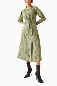 Lana dress in Circuit print features an attached skirt that flows seamlessly into a sleek sheath silhouette, offering a sophisticated and flattering fit. The waist is defined with a tie-up and loop detail, allowing for a customizable and tailored look. Long, sleek sleeves with half-elasticated tall cuffs are an interesting add-on. The top stitch detailing provides a subtle yet distinctive finish, enhancing the dress's elegant lines.