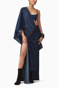 Featuring Lara Quilted Denim Bralette & Zip-Detail Denim Sari by Saaksha & Kinni, this bold set includes a quilted denim infinity bralette and a denim sari with striking zip detailing. The combination of edgy denim with traditional draping offers a unique, contemporary twist on classic style.
