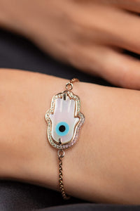 Hamsa hand Mother of Pearl Evil Eye bracelet with diamond in 14KT Rose Gold are featured from our Everyday Luxury Collection, which is easy to wear and can take you from day to night. Stone : Full Cut Diamonds & Hamsa Hand Mother of Pearl Evil Eye (15 mm)