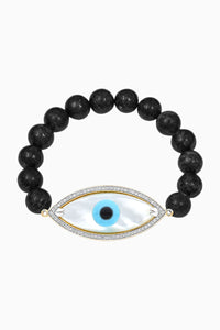 Large Marquise (30 mm) Mother Of Pearl Evil Eye and Full Cut Diamond Bracelet with Black Onyx Beads.