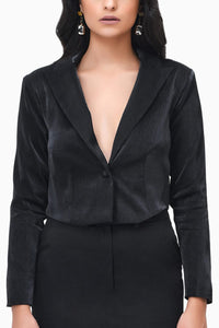 Make a statement with this sleek cropped jacket, designed with a minimalist aesthetic. Its clean lines, sharp lapel, and structured fit give it a sophisticated edge, while the single-button closure adds a modern touch. Perfect for adding a layer of elegance to your evening look or elevating a simple outfit.