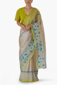 In a serene beige hue, the Lasting Vignettes Jamdani saree is handwoven in the finest organza mulberry silk. The standout detail are the scattered blue Jamdani flowers, meticulously woven into the pallu border.