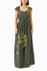 Offbeat and earthy, the Lateefa Dress will be essential day-to-night garment in your wardrobe. The dress is cinched at the waist, and its chequered fabric with embroidered leaves and subtle beauty to a simple yet impactful look.