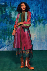 Introducing our chanderi gradient color panelled patchwork stand collar shirt dress, featuring an elegant inner adorned with applique embroidery on jute at the hem. This stylish dress combines vibrant colors and intricate details, making it perfect for both casual and festive occasions.