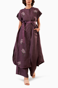 Featuring our Lavender Dahlia Block Print Long Shirt Top paired with Flare Pant and Short Slip. This elegant ensemble is tailored with a shirt in gauze and pants in linen, offering a comfortable and stylish look for any occasion.