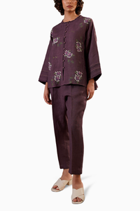 Elevate your everyday style with this chic linen ensemble featuring a lavender dahlia block print shirt top paired with tailored straight pants. Embrace comfort and sophistication effortlessly with this versatile and trendy look.