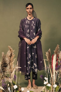 Featuring Lavender Embroidered Kurta Set by ARCVSH, pleated Mul Chanderi fabric showcases lavender discharge prints and intricate sleeve embroidery, complemented by a sheer organza dupatta. A refined combination of texture and artistry for timeless elegance.