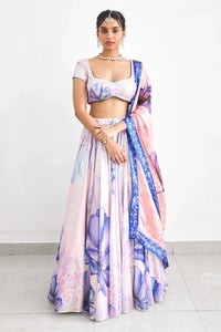 A purple dream that shimmers with sequined elegance. Paired with a printed dupatta, this lehenga set blends soft romance with festive glamour, perfect for twilight celebrations.