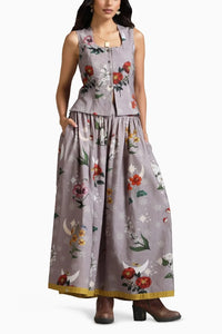 This coordinated set features a printed waist coat paired with an ankle-length gathered skirt giving an elevated look. The skirt comes with a front belt, an elasticated back and a side zipper opening.