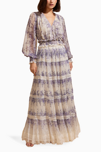 Featuring Lavender Whimsy Printed Set by Roseroom, a captivating White and Lavender Top and Skirt ensemble. Crafted from French Chiffon, adorned with printed embroidery and delicate laces, offering a standard fit for chic sophistication.