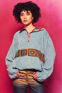 A stylish corduroy shirt embellished with intricate crochet patchwork, blending the classic texture of corduroy with the artisanal charm of crochet. This unique piece adds depth and visual interest to any outfit, making it a versatile addition that effortlessly elevates both casual and chic ensembles.