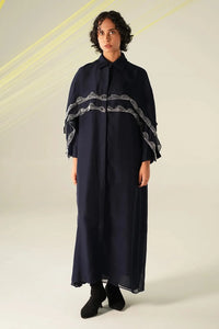 Featuring an ankle-length shirt dress in 100% viscose organza, this piece showcases full sleeves topped with two layered kimono-style panels. Both panel hems are beautifully highlighted with hand wave embroidery for a delicate, artisanal finish.